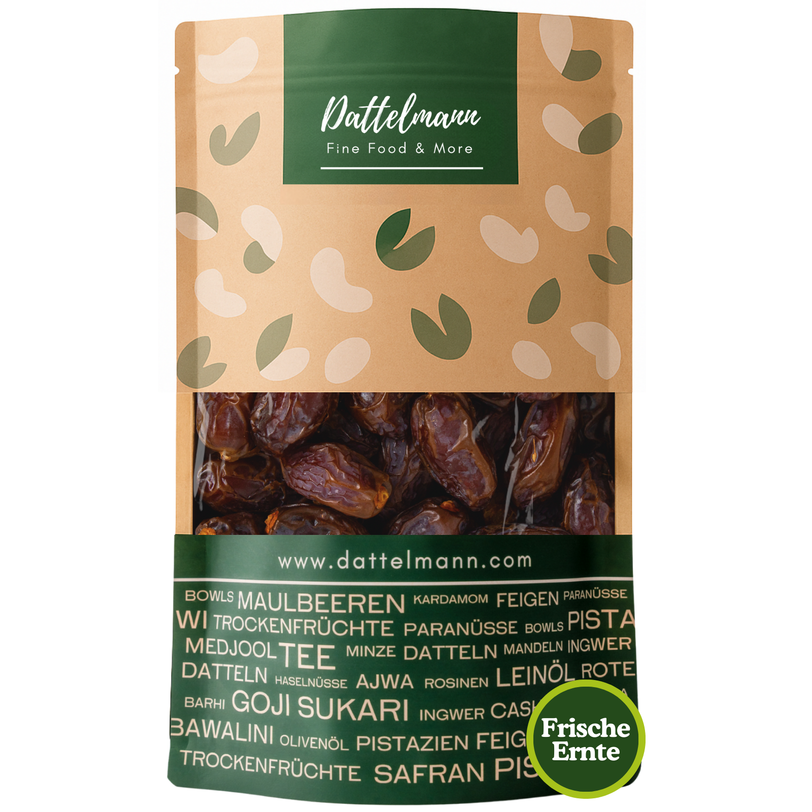 Mūsų Premium Jumbo Medjool datulės, dar žinomos kaip karališkosios datulės, yra natūralių saldumynų karalienės. Didesnės, sultingesnės ir minkštesnės nei XL dydžio Medjool datulės – tai tikra gamtos dovana sveikai mitybai.