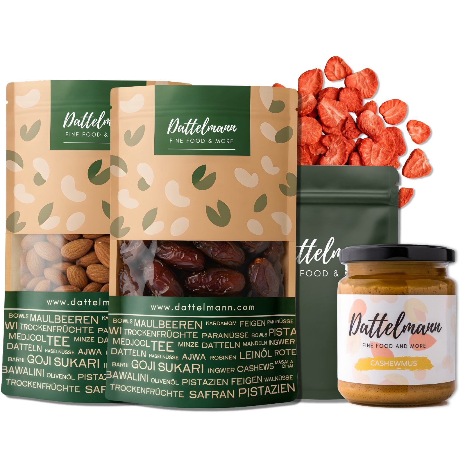 Natūralių saldžių užkandžių rinkinys – puikiai tinka naminiams skanėstams gaminti||Jei mėgstate sveikus užkandžius, natūralius ingredientus ir naminius desertus, šis mūsų rinkinys yra puikus pasirinkimas jūsų virtuvei.||Rinkinį sudaro keturi aukščiausios kokybės ingredientai, puikiai derantys tarpusavyje:|1. „Medjool Deluxe XL“ datules (1 kg)||2. ekologišką anakardžių sviestą (250 g)||3. ekologiškus migdolus (500 g)||4.liofilizuotas braškes (100 g). Kartu jie sukuria gardų natūralaus saldumo, kreminės tekstūros, traškumo ir vaisių skonio mišinį.||Rinkinys puikiai tinka kepiniams, užkandžiams ir pusryčiams: naudokite šį rinkinį energiniams kamuoliukams, kokteilių dubenėliams, jogurto užpilams, granolos mišiniams ar sveikiems desertams gaminti. Puikus kremiškumo, traškumo ir vaisinio saldumo derinys.||Sutaupykite įsigydami rinkinį – mėgaukitės daugiau už mažiau: įsigykite keturis aukščiausios kokybės produktus viename patogiame rinkinyje ir sutaupykite, palyginti su tuo, jei juos pirktumėte atskirai. Mes kruopščiai atrenkame ir perkame produktus, kad užtikrintume autentišką skonį, šviežumą ir aukščiausios kokybės ingredientus.