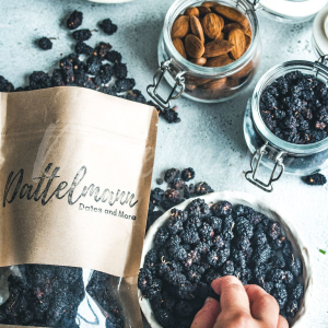 | 100 % ekologiškos juodosios šilkmedžio uogos iš Turkijos: natūraliai džiovintos saulėje, be pridėtinio cukraus, konservantų ir sulfitų.| Retos ir aukščiausios kokybės: Daugiau skonio ir antioksidantų nei baltosios šilkmedžio uogos| Maistingųjų medžiagų kupinas supermaistas: Daug geležies, skaidulų ir antocianinų, palaikančių sveikatingumą.| Skaniai saldus ir rūgštus: Drąsus skonis, kuris pagardina kokteilius, avižinius dribsnius ir kepimo receptus.| Tvariai išgaunama ir renkama rankomis: kruopščiai atrinktos, kad būtų užtikrintas maksimalus šviežumas ir kokybė| Veganiškas ir be glitimo užkandis: Puikiai tinka švariai mitybai, žaliavalgystės dietoms ir užkandžiavimui be kaltės jausmo.|