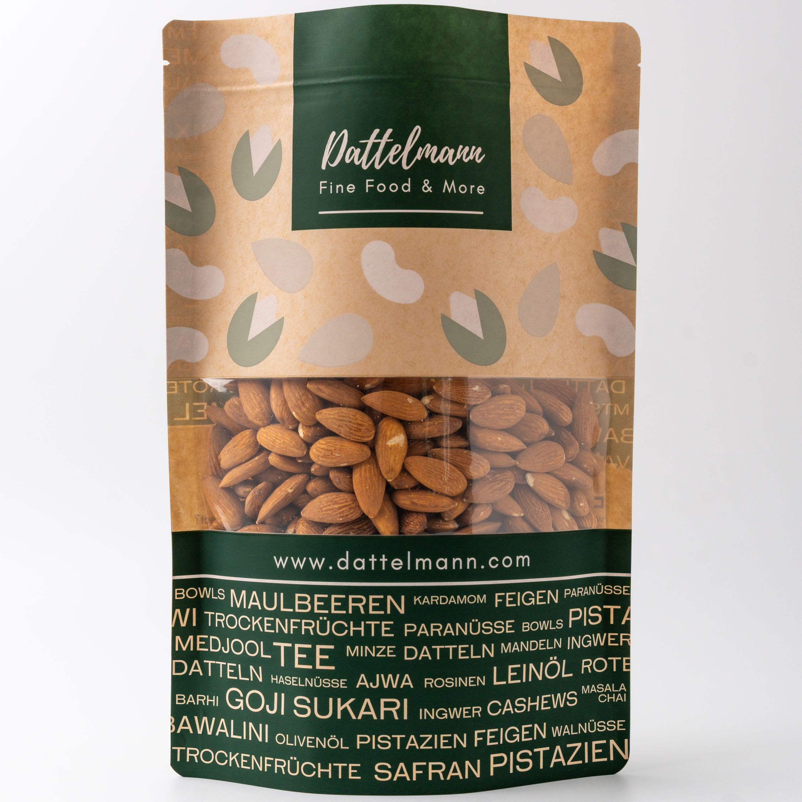 | |🌿 100% Natūralūs Kalifornijos Migdolai (Carmel Supreme, nepastrizuoti)|| |💪 Daug Baltymų (21,2 g/100 g) & Skaidulų (12,5 g/100 g)|| |❤️ Vitamino E, Magnio & Sveikųjų Riebalų šaltinis|| |🌱 Tvariai auginti Kalifornijoje – be GMO & nepastrizuoti|| |🥗 Puikiai tinka užkandžiams, kepiniams, kokteiliams & dubenėliams|| |✅ Premium kokybė, šviežiai supakuoti Datules Vokietijoje||